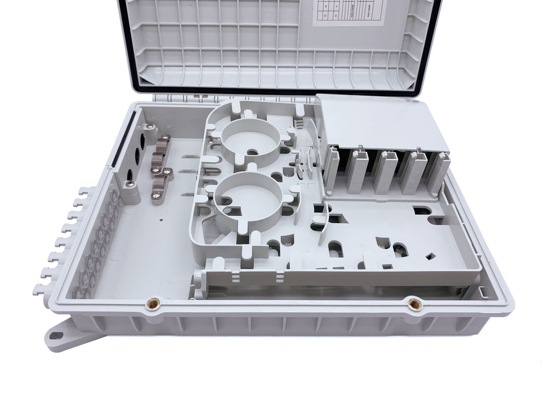 هناك منطقة منفصلة للاندماج، منطقة التقسيم وتوزيع، متعددة الوظائف، مع علامة ملصق الكابلات و علامة الليزر لتذكير البناء أو الإصلاح أو الاستخدام المستقبلي.الصندوق بأكمله مغلق تماماً ومغلق بالختم المطاطي، تلبي معيار IP65 الخارجي المقاوم للماء، وهناك العديد من المقاوم المخطط على الجزء الداخلي من الغطاء للاستخدام بشكل أفضل في شبكات fttx.