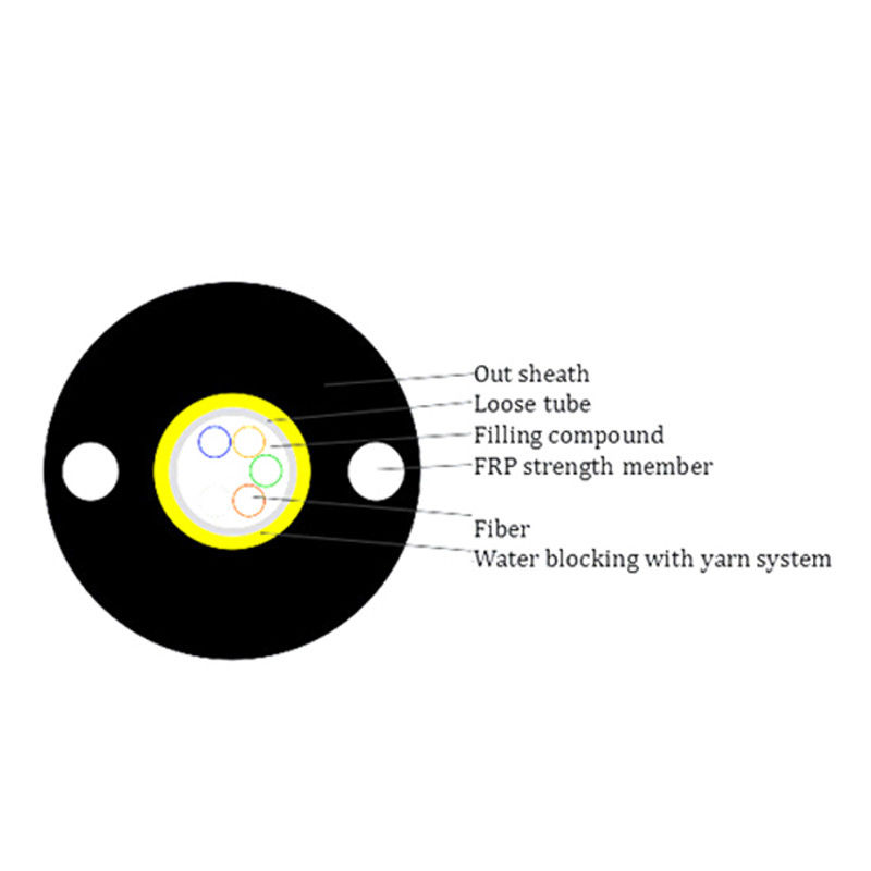 يتم وضع الألياف في أنبوب فضفاض مصنوع من البلاستيك عالي المعامل.تمتلئ الأنابيب بمركب تعبئة مقاوم للماء.خارج الأنبوب السائب PBT، هناك خيوط أراميد (كيفلر) لعضو القوة، ويتم وضع عضوين قوة FRP متوازيين على كلا الجانبين.يتم تجهيز الكابل بغمد من البولي إيثيلين (PE).